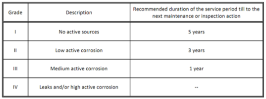 Jika lantai dinilai dengan Grade IV, maka inspeksi lanjutan pada bagian dalam direkomendasikan untuk mengklarifikasi indikasi dan melakukan tindakan perbaikan yang tepat. Jika operator tangki bermaksud melakukan pengawasan berkala dengan AET, pengukuran nol dimulai setelah perbaikan plat lantai dan tangki telah dioperasikan kembali tiga hingga enam bulan kemudian untuk memberikan referensi pengukuran lebih lanjut. Durasi yang direkomendasikan dari periode operasi hingga tindakan pemeliharaan atau inspeksi berikutnya untuk Grade I hingga III sehubungan dengan kondisi operasi yang diberikan sebelum dan selama pengujian.
