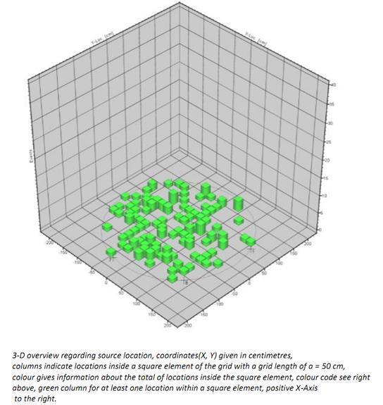 Data mentah yang berasal dari semua sinyal emisi yang ditimbulkan oleh aktifitas deformasi lantai tangki, direkam oleh sensor – sensor tersebut selama waktu pengujian, kemudian disaring dan divisualisasikan oleh software yang memperlihatkan top view, tampilan lantai tangki dari atas, letak lokasi sensor, lokasi man-hole, dan lokasi sumber kebocoran dan/atau korosi, seperti penampakan dibawah ini.