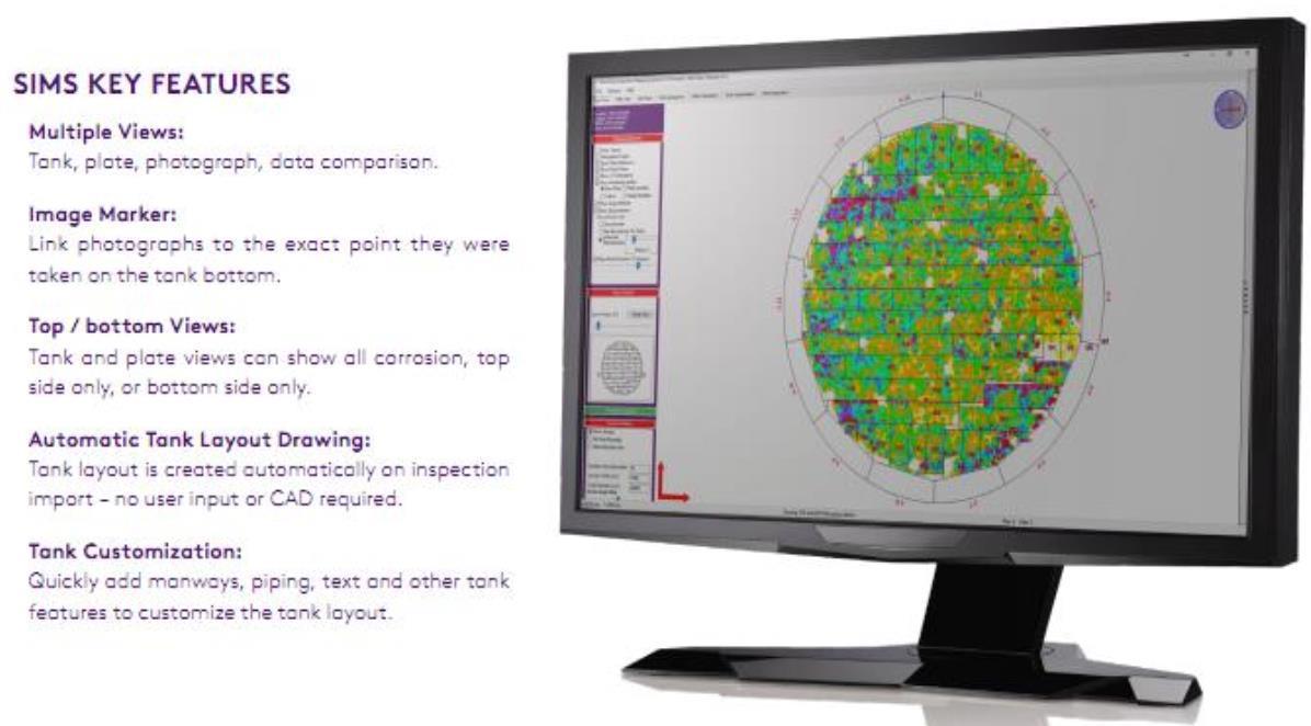 Silverwing Inspection Mapping Software (SIMS) secara otomatis membuat peta korosi plat dasar tangki yang diperiksa dan dengan kecepatan hingga 1 meter/detik, floor map menyempurnakan proses pemeriksaan secara menyeluruh.